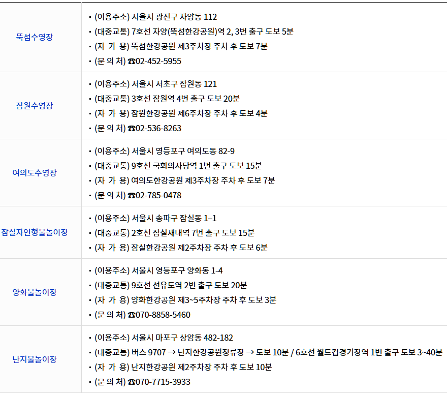 >>한강 물놀이장/수영장 주차장위치 바로 확인하기